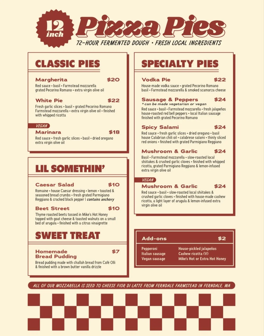 We partner with Whit’s Pizza Pies to provide you with the highest quality pizza straight from New York. Keep an eye on their Instagram page for exciting specials!